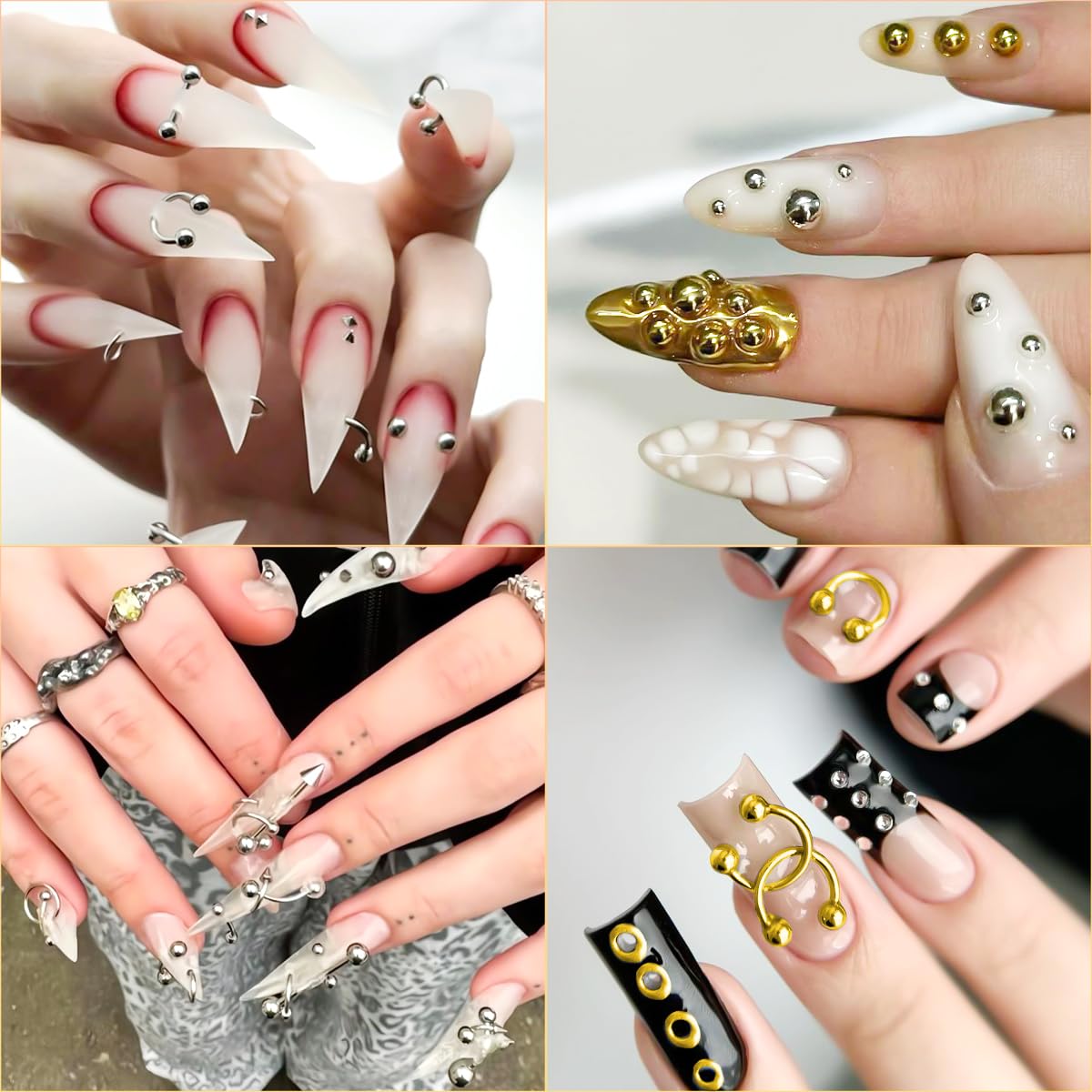 - 【Gold & Silver Pearls for Nails】The set not only includes piercing nail art accessories, but also comes with gold and silver flatback pearl nail charms. They are abundant in quantity and come in six sizes. Mix with goth punk nail studs to create endless possibilities for DIY nail art